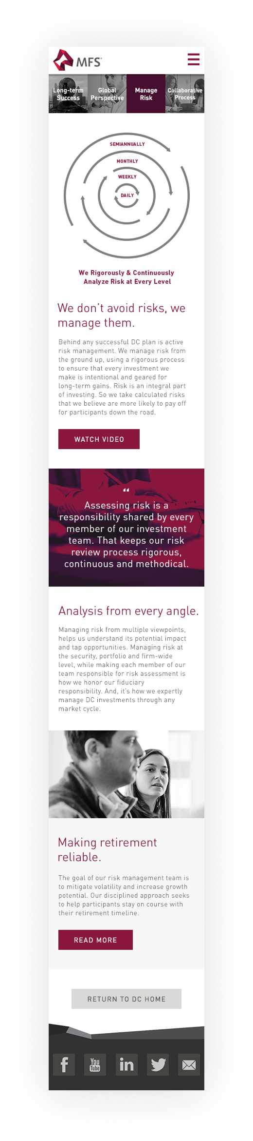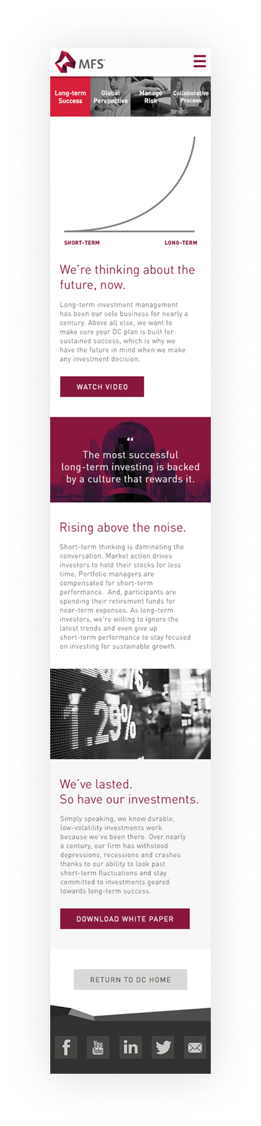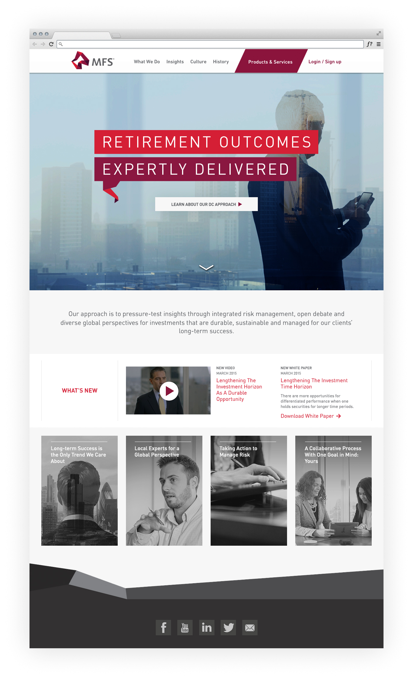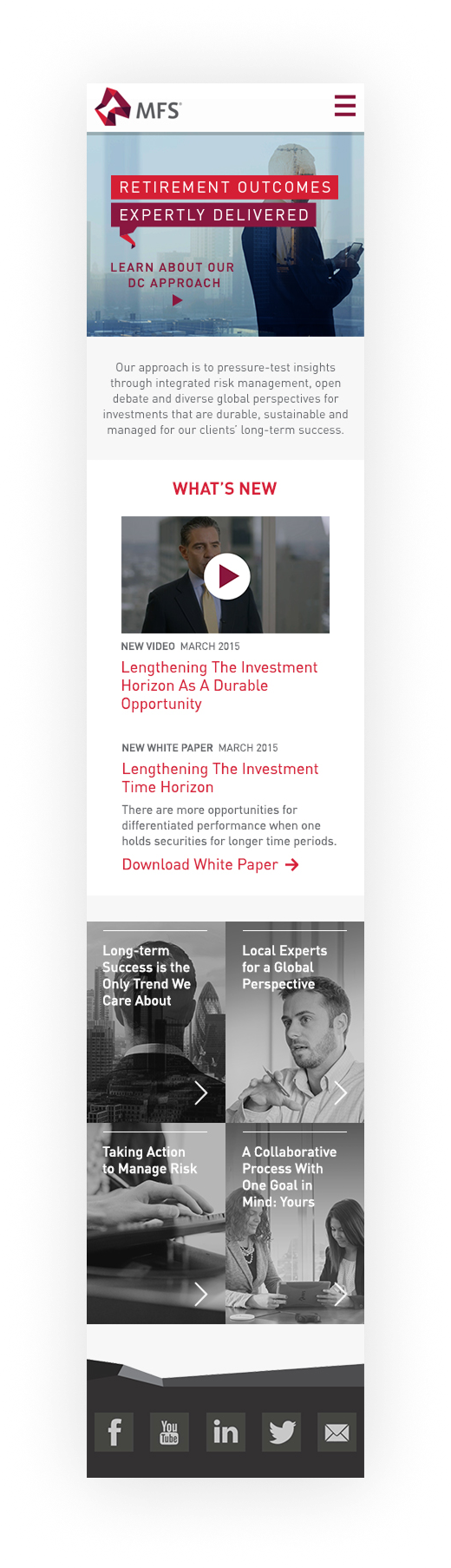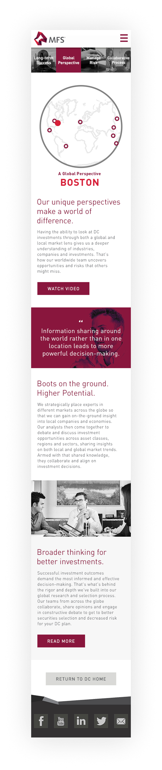 MFS is an investment management company with an long history of impressive results. With that in mind, they wanted a forward-looking Defined Contributions (DC) web presence that also made people aware of the depth of experience they bring to investment management.